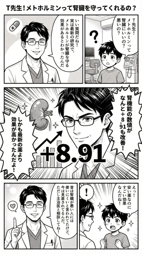 「いい質問だね、たろうくん!実はね、最近の研究でメトホルミンが腎臓を守る効果があることがわかってきたんだよ。2025年に発表されたランダム化比較試験という信頼性の高い研究があるから、今日はそれを紹介するね。」