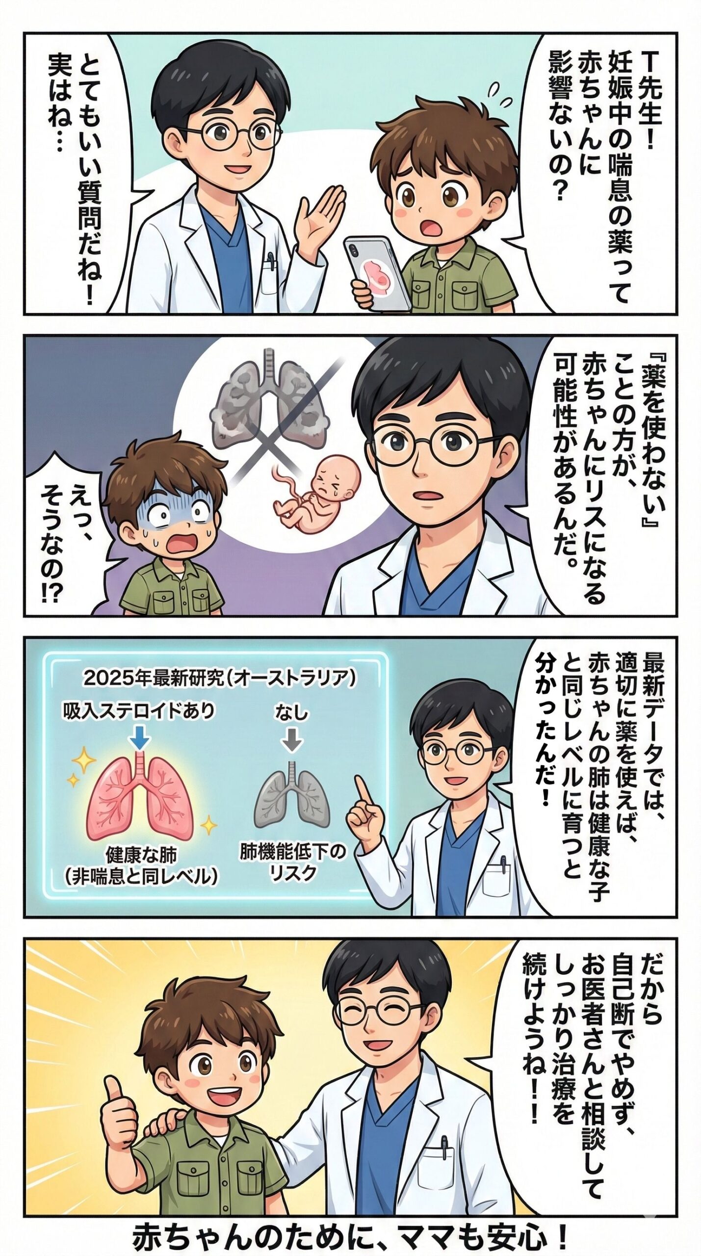「そうだね。この研究は、『吸入ステロイドはお母さんの喘息管理だけじゃなく、赤ちゃんの肺の発達にも良い影響がある』という説明ができる、とても大切なエビデンスなんだ。妊娠を理由に自己判断で薬をやめてしまうのは、かえって良くないんだよ。」