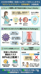 「とても大事なニュースだね!2026年4月から、RSウイルス感染症を予防するワクチン(アブリスボ)が、妊婦さんを対象に定期接種として始まることになったんだよ。」